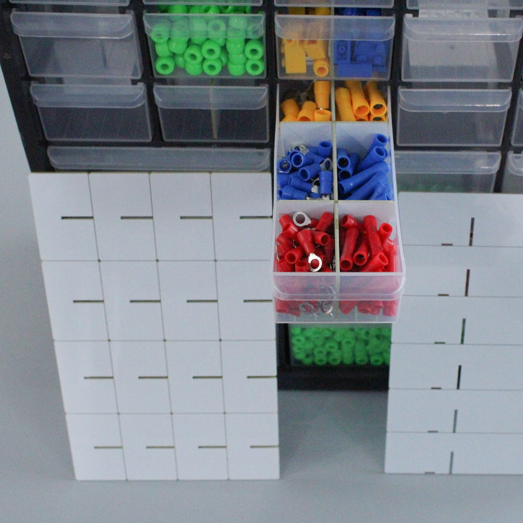 Craftsman storage bins are a very popular choice for sorting numerous types of small parts including nuts, bolts, screws, Legos, beads, crafts, tools, classroom supplies, electronic components, as well as others. We were using many of them in our electronics lab as an electronic component organizer. The problem though is they don't effectively use most of the available bin space, and in many of the bins we found we were wasting up to 99% of the space. This lead us to develop a better way to use the available space. Our dividers allow efficient use of the space by allowing adjustable divisions from 2 to 8 partitions. Ultimately, you will need fewer bin units, saving you space and money. As a hardware storage organizer, you could now condense up to 8 bins of small nuts, bolts, screws, and nails down to a single bin. As a Lego storage organizer, even the smallest components can be separated into their own bin. For teachers, you can combine your teacher toolbox and your art storage cabinets into a single unit, saving you valuable classroom space as well. As a bead storage organizer, you can configure the divisions in numerous ways to effectively sort the most and lease frequently used beads.